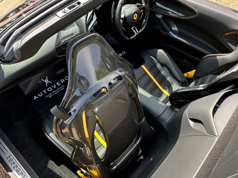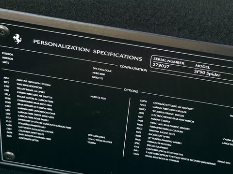 ADAPTIVE FRONTLIGHT SYSTEM, TWO-TONE BODYWORK, YELLOW BRAKE CALLIPERS, CARBON FIBRE SIDE AIR SPLITTER, ENGINE COVERS IN CARBON FIBRE, CARBON FIBRE REAR BOOT TRIM, REAR DIFFUSER IN CARBON FIBRE, CARBON FIBRE UNDER-DOOR COVER, CARBON FIBRE DRIVER ZONE + LEDS, CARBON FIBRE DOOR PANELS, UPPER PART OF CENTRE CONSOLE IN CARBON FIBRE, COLOURED INNER DETAILS, CLDT IN OFF-CATALOGUE LEATHER (GIALLO), GIALLO YELLOW SAFETY BELTS, DASH INSERTS IN CARBON FIBRE, SUSPENSION LIFTER, CAVALLINO STITCHED ON HEADREST, THREAD IN GIALLO, CARBON FIBRE FRONT SPOILER, 'SCUDERIA FERRARI' SHIELDS, ELECTROCHROMIC REAR-VIEW MIRROR, PARKING CAMERA, FRONT AND REAR PARKING SENSORS, DAYTONA RACING SEATS (LARGE), RACING SEAT LIFTER, 20" FORGED DIAMOND WHEELS, PREMIUM HI-FI SYSTEM, COLOURED SPECIAL STITCHING (GIALLO), WHEEL STUD BOLTS IN TITANIUM.