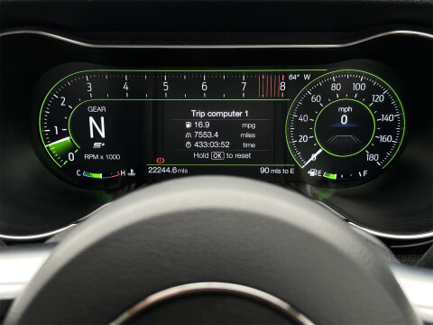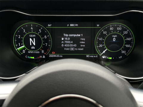 Finished in the ubiquitous Dark Highland Green with a full leather Recaro interior, this 2020 Bullitt rides on 19' 5-spoke alloys with polished edges which sit above red Brembo callipers.