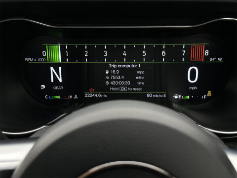 Sit in the green-stitched Recaro bucket seat, grip the cue-ball gearknob, press the glowing red starter button and the engine growls to life. Tune the exhaust to your perfect sound, select your throttle response, alter your steering speed, change the colour of the ambient lighting, soften the suspension with the Mag-Ride - it even has line lock for the hooligan (child) in you.