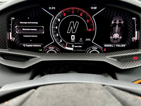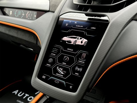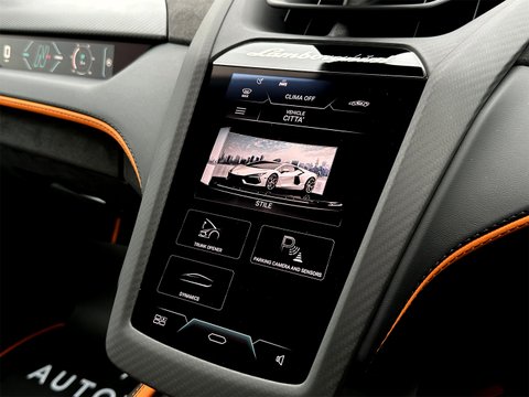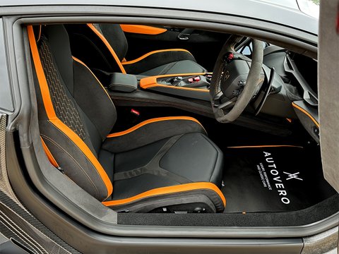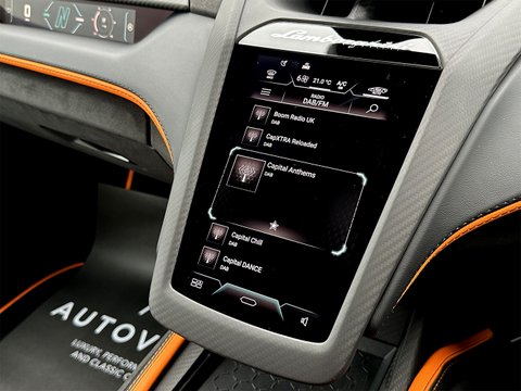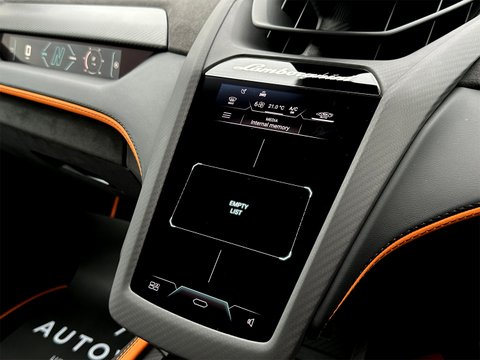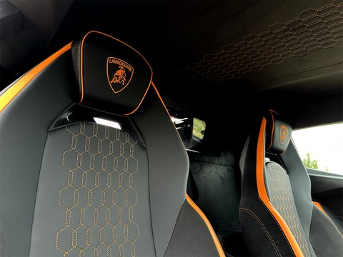 INTERIOR - Fully Electric and Heated Seats, Touch Passenger Display, Ad Personam Seats, Ad Personam Door Panels, Ad Personam Tunnel and Console, Ad Personam Lower Dashboard, Contast Trim in Arancio Leonis, Corsa Tex Pack, Floor Mats with Leather Border, Inverted Stitching, Arancio Leonis Seat Belts, Bi-Colour Carpets and Mats, Embroidered Lamborghini Logos, Interior Carbon Package, Q-citura Throughout, Steering Wheel in Full Corsa Tex, Smartphone Interface and Connect.
