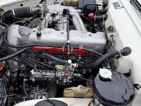 In 1977, it benefitted from the engine being replaced at 42k miles by the Mercedes Main Dealer, Charle Sidney of Bradford. Additionally, the Mercedes supplied Engine ID Plate has been added to the bulkhead as per dealer guidelines at the time.